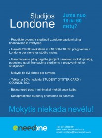 Bendrovė „Need one Ltd“ turi didelę patirtį teikiant pagalbą asmenims, norintiems studijuoti Londone. Anglijos mokymo įstaigų sistemą perkandę specialistai nemokamai padės susigaudyti, kokius dokumentus pateikti ir kokias procedūras atlikti siekiant patekti į norimą aukštąją mokyklą.