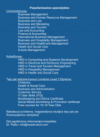 „Jums pradžiai būtina turėti pasą ir minimaliai mokėti anglų kalbą, o mes suteiksime pagalbą stojant į aukštojo mokslo įstaigą, padėsime gauti finansavimą studijoms ir pragyvenimui kol studijuosite. Mūsų universitetai, tokie kaip Anglia Ruskin University, Roehampton, University of Ulster, University of Essex, Northumbria University, University of Sunderland ar koledžai, sakysim, City of Westminster college, Mont Rose college of Management and Sciences, ICON college, yra vieni iš populiariausių ir juose yra platus įvairių specialybių sąrašas. Kai kurie universitetai turi ,,Foundation year“ programą, kuri jus paruoš ateinantiems 3 bakalauro metams“, – sako Svetlana.