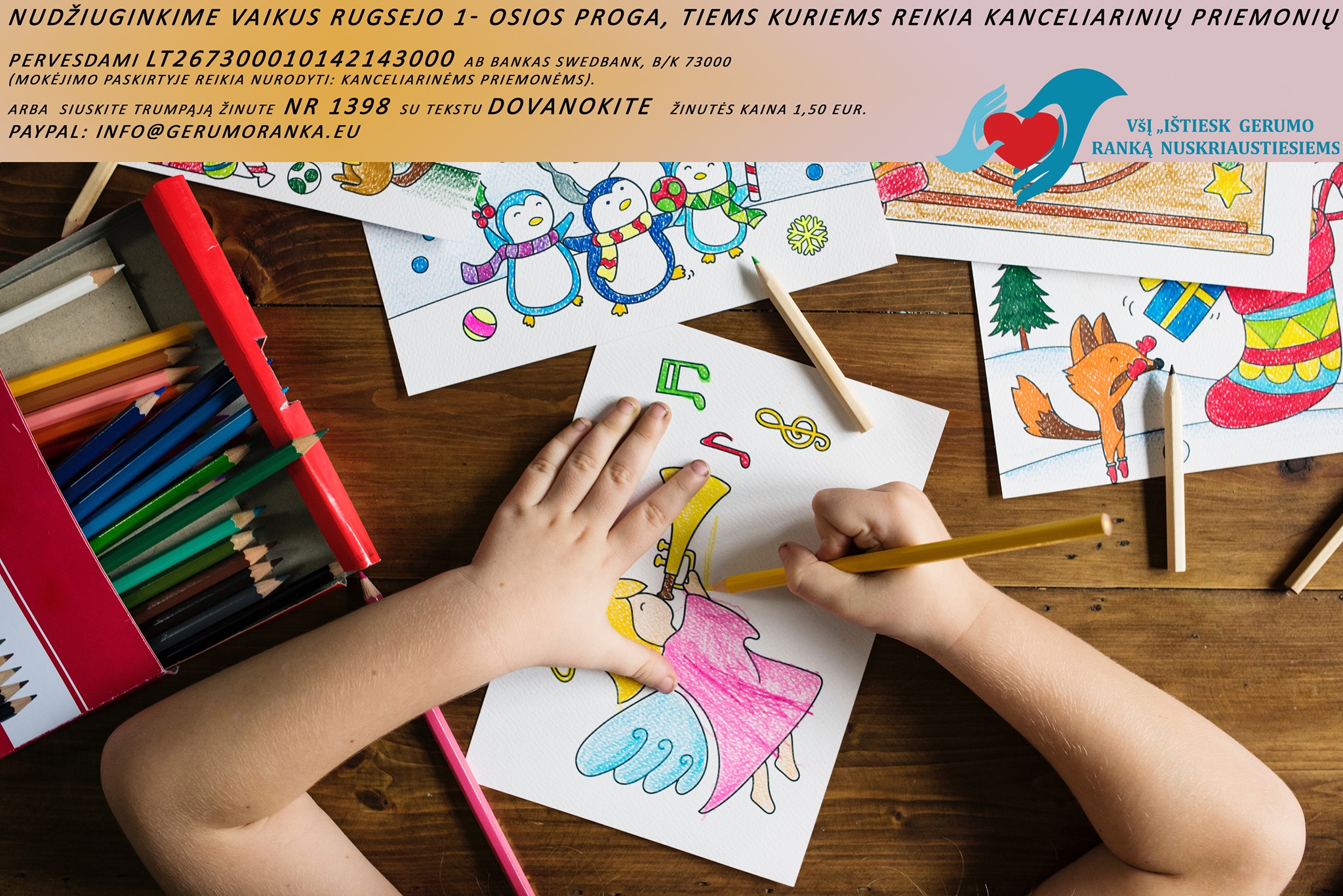 Kviečiame visus prisijungti prie akcijos, kuri vyks nuo rugpjūčio 9 dienos iki rugsėjo 30 dienos. Akcijos metu renkame lėšas įsigyti mokyklinių priemonių vaikams, kurių tėveliams ypatingai sunku vaikučius aprūpinti reikmėmis mokyklai. Amžiaus grupės neįvardiname, nes yra įvairių atveju.