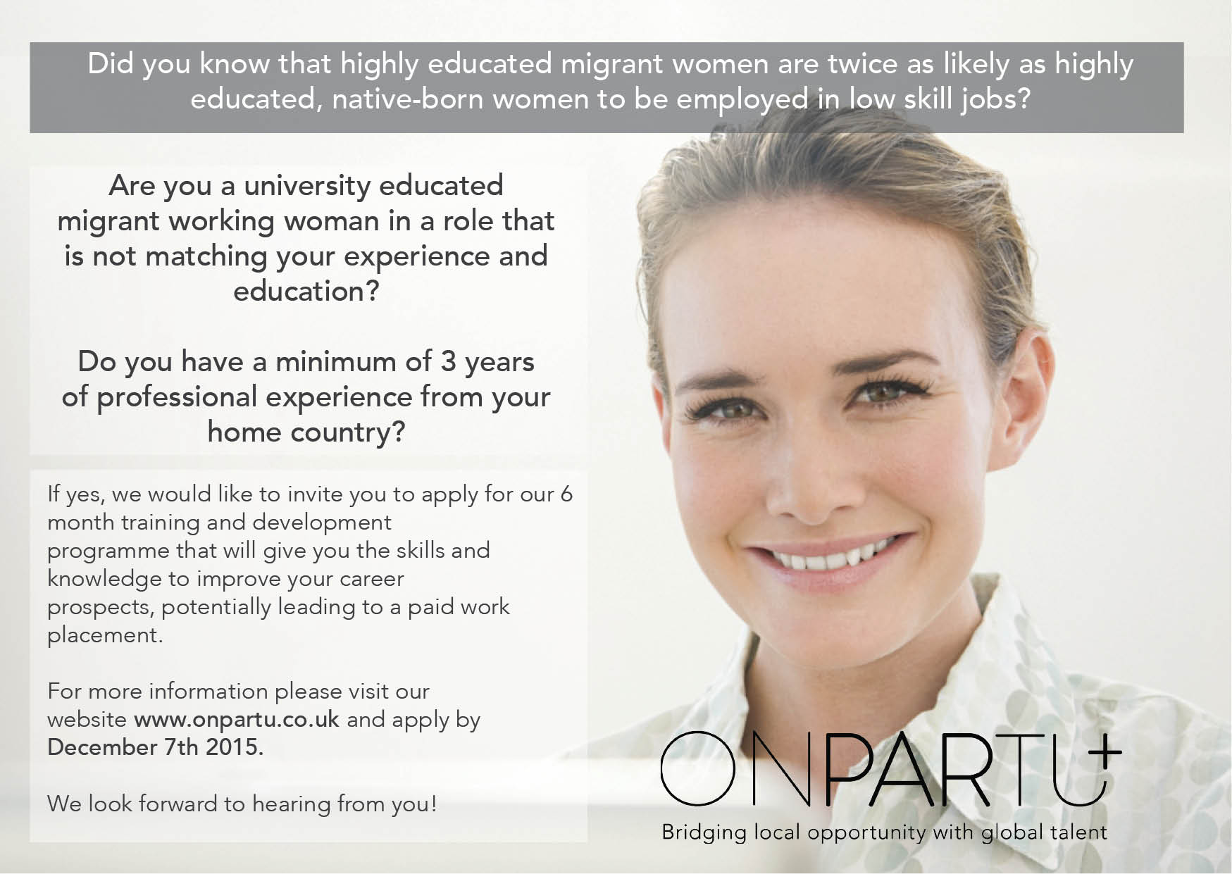 Labai dažnai manome, kad išsilavinimo ir igūdžių, kuriuos įgijome savoje šalyje, nepakanka naujoje ir nepažįstamoje darbo rinkoje - bet ar tai iš tikrųjų tiesa? Onpartu tikslas yra padėti iš Centrinės ir Rytų Europos emigravusioms moterims rasti jų kvalifikaciją, išsilavinimą ir profesinę patirtį atitinkantį darbą Jungtinėje Karalystėje.