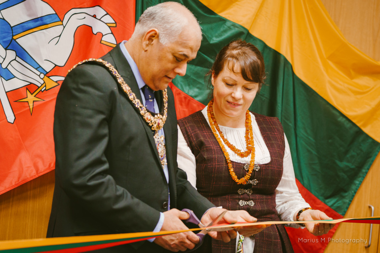 Po sveikinimo kalbos meras ir Diana Valiukonienė perkirpo lietuvišką juostą, taip duodami pradžią lietuviškų knygų lentynai šio miesto Centrinėje bibliotekoje.