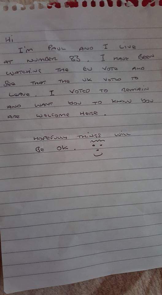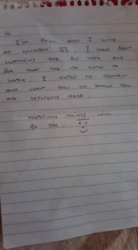 Esu Paul ir gyvenu name, kurio numeris 83. Stebėjau referendumą dėl šalies narystės ES ir matau, kad JK nusprendė pasitraukti. Aš balsavau už tai, kad šalis liktų ES, todėl noriu, kad žinotumėt, jog esate laukiami.