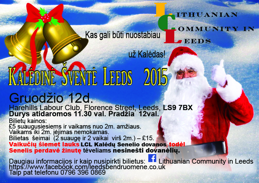 Bilietai: £5 suaugusiesiems ir vaikams nuo 2m. amžiaus. Vaikams iki 2m. įėjimas nemokamas. Bilietas šeimai (2 suaugę ir 2 vaikai virš 2m.) – £15. Bilietus iš anksto galite įsigyti internetu (Lithuanian Community in Leeds, Sort code: 77-14-04, account: 28532968 į reference rašykite savo vardą ir pavardę). Bilietus taip pat bus galima įsigyti prie įėjimo.