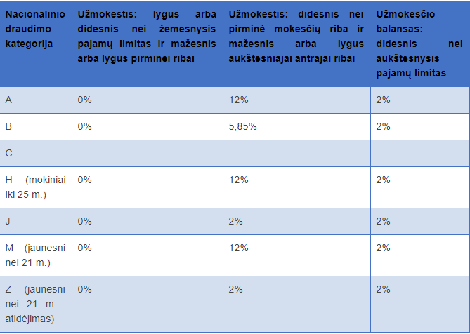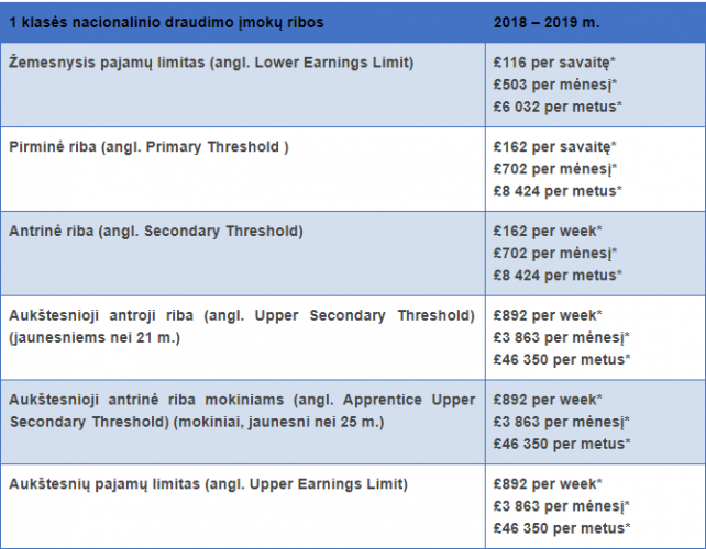 1 klasės nacionalinio draudimo įmokos yra mokamos tik tada, kai atlyginimas viršija žemesnįjį pajamų limitą (angl. Lower Earnings Limit).