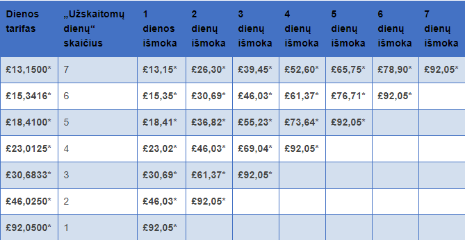 Variklio tūris 1400 cm3 ar mažiau – benzino įkainis už mylią 11 pensų; suskystintų naftos dujų įkainis už mylią 7 pensai