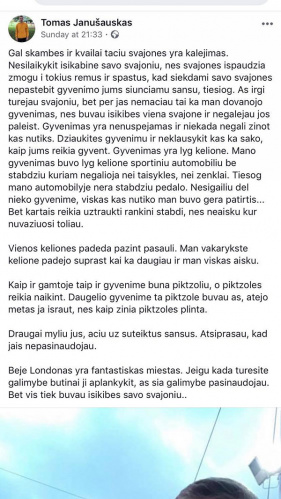 Sekmadienio vakarą, 21:33 Anglijos laiku, paskelbė postą ant savo "Facebook" sienos iš Londono su dviprasmišku atsisveikinimu.