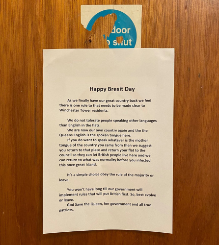 Ne itin malonaus sveikinimo (jį visą galite perskaityti nuotraukoje) su „Brexit“ diena praėjusio penktadienio rytą sulaukė vieno daugiabučio Norwiche gyventojai: visuose penkiolikoje „Winchester Tower“ daugiabučio aukštų ant durų buvo prikabintas „sveikinimas“, kuriame nurodoma name kalbėti tik angliškai.
