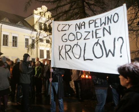 „Mes norime referendumo būdu nuspręsti, ar prezidentas L. Kaczynskis turi būti palaidotas šioje vietoje“, – reikalauja prie pilies susirinkę Krokuvos gyventojai, daugiausia – jaunimas, laikantis plakatus ir transparantus su protestas prieš sprendimą laidoti prezidentą Vavelyje.