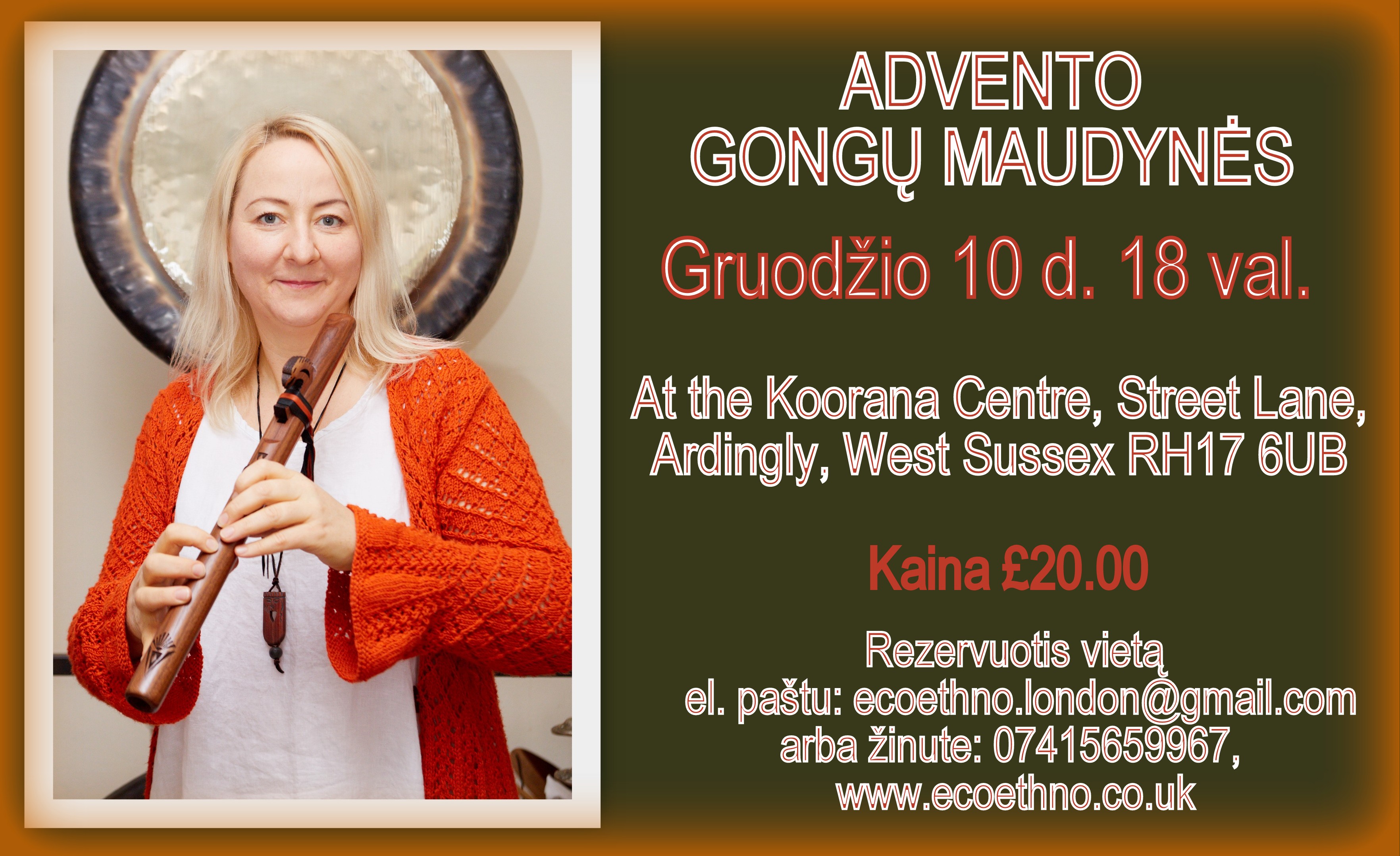 Bilietai: „Gongų maudynių“ kaina 20 GBP. Vietų skaičius ribotas, todėl būtina išankstinė registarcija tel.: 07415659967 (Birutė) arba el. paštu: ecoethno.london@gmail.com. Mokėti galima atvykus arba iš anksto pavedimu: http://www.ecoethno.co.uk/product/sound-therapy-meditation-gong-bath-10th-december-6-00-p-m-at-the-koorana-centre/.