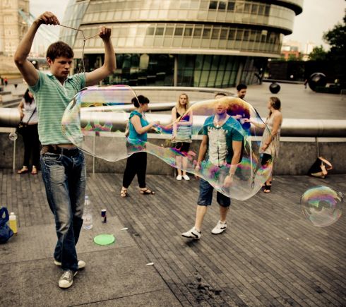 "Burbuliatoriai' Londone, kaip ir Lietuvoje, susitinka kas antrą pirmadienį 18.30 vis kitoje žymioje vietoje, ir gatvėje pučia muilo burbulus. Taip tirpdomi bendravimo ir kultūriniai barjerai: ir atsitiktiniai praeiviai, ir dalyviai susipažįsta, paplepa apie šį bei tą, o neretai ir baigia kartu vakarą su alumi ar vyno taure artimiausioje užeigoje.