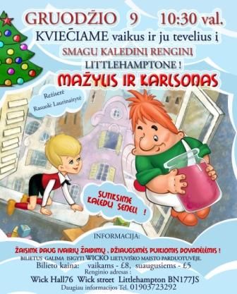 Pietų Anglijos Littlehamptono mieste ir Britanijos sostinėje Londone gyvenantys tėveliai ir vaikučiai kviečiami į lietuvišką Kalėdų šventę. Artėjančių Kalėdų proga vaikai su tėveliais galės pamatyti Rasuolės Laurinaitytės režisuotą spektaklį “Mažylis ir Karlsonas”, susitikti su Kalėdų seneliu. Renginio organizatoriai žada daug įvairių žaidimų ir puikių dovanėlių.